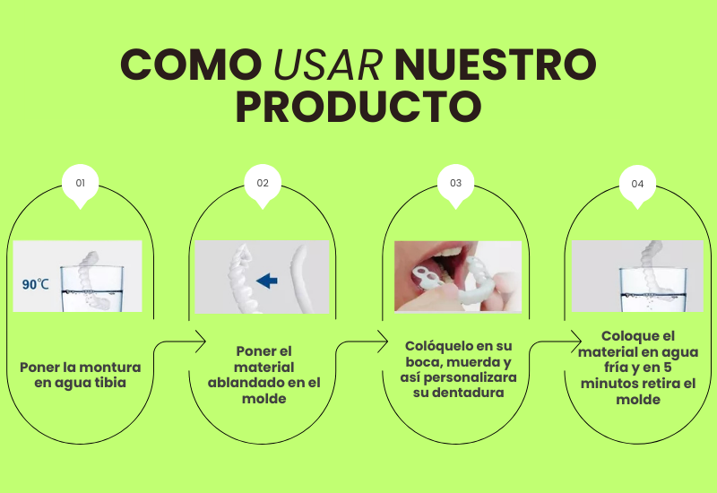 Nuestras carillas se ajustan fácilmente con agua caliente. Solo necesitas calentarlas, moldearlas sobre tus dientes y disfrutar de una sonrisa perfecta al instante.